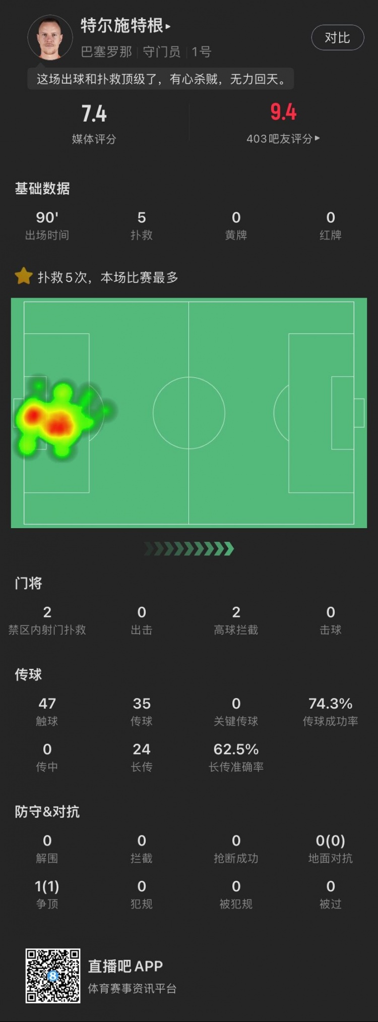 尽力局!特尔施特根本场:5扑救,被射21脚丢4球,并列队内最高分