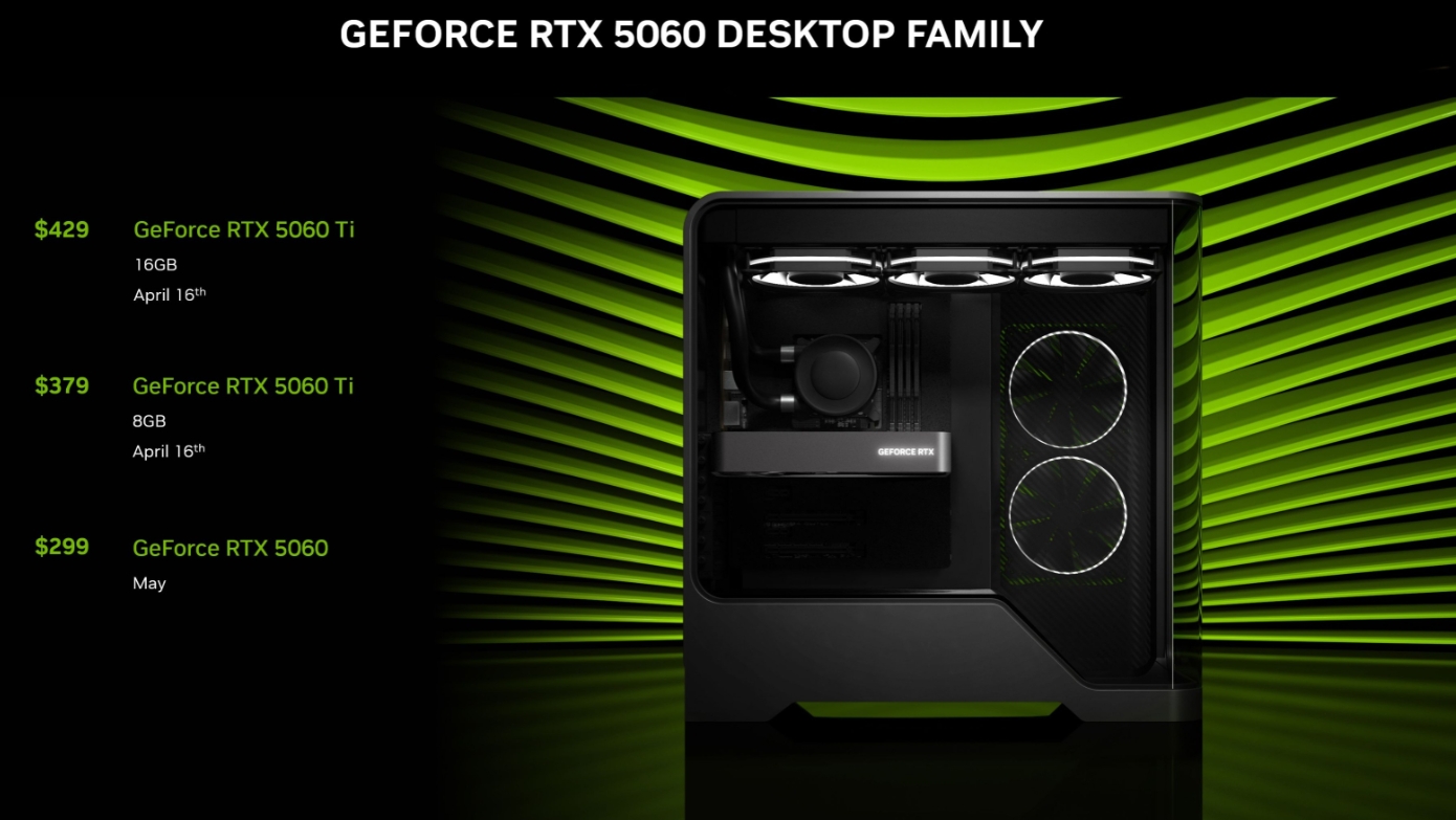 在发售时间上,RTX5060显卡将于今年5月发售,RTX 5060 Ti显卡则于4月16日发售。