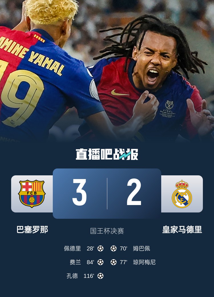 国王杯决赛,巴萨3-2皇马夺队史第32座国王杯。上半场,门迪伤退,佩德里破门,维尼修斯造点被取消;下半场,姆巴佩定位球直接破门,琼阿梅尼头槌反超,库尔图瓦出击失误送费兰空门,VAR取消巴萨读秒点球改判假摔;加时赛,孔德第116分钟远射制胜。