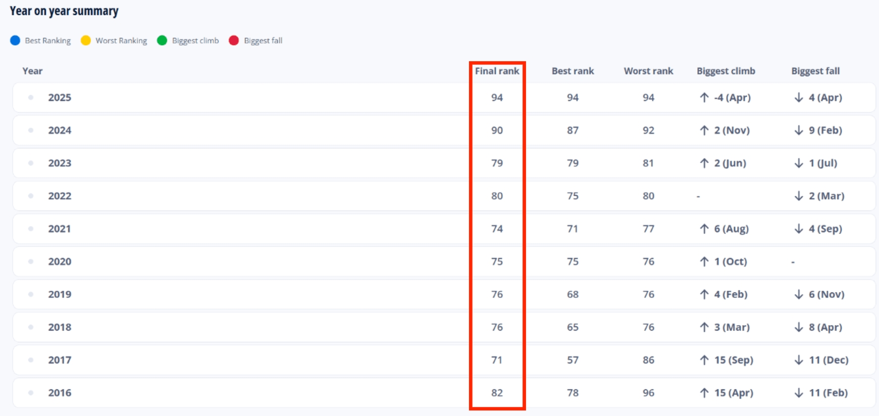 根据FIFA官方最新给出的排名,中国男足目前排在世界第94位,近十年最低。而印尼男足目前排在世界第123位,处于近十年最高排名位置。