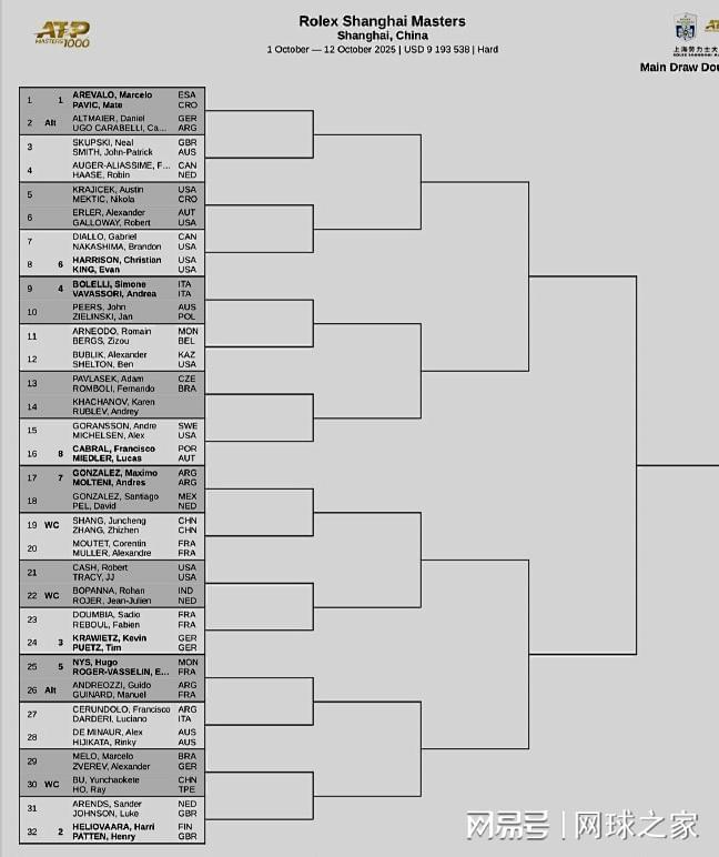 另外,上海大师赛的男双签表昨天下午出炉。中国有两对组合参赛,其中商竣程/张之臻首轮对阵法国组合穆泰/A-穆勒,布云朝克特/何承叡迎战梅罗/兹维列夫。