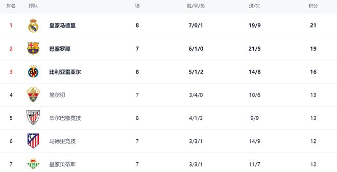 在积分榜上,皇马暂时登上了榜首位置。皇马拿到21个积分。而巴萨掉到第2名,只拿到19分。不过,巴萨比皇马少踢1场。比利亚雷亚尔输球之后,依然是16分,排名第3。埃尔切和毕尔巴鄂竞技都是13分,排名第4和第5。马竞3胜3平1负,拿到12分,排名第6。皇家贝蒂斯和西班牙人也是12分,排名第7和第8。