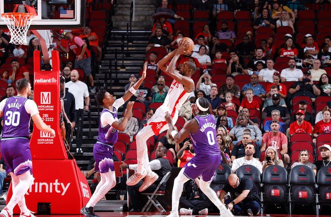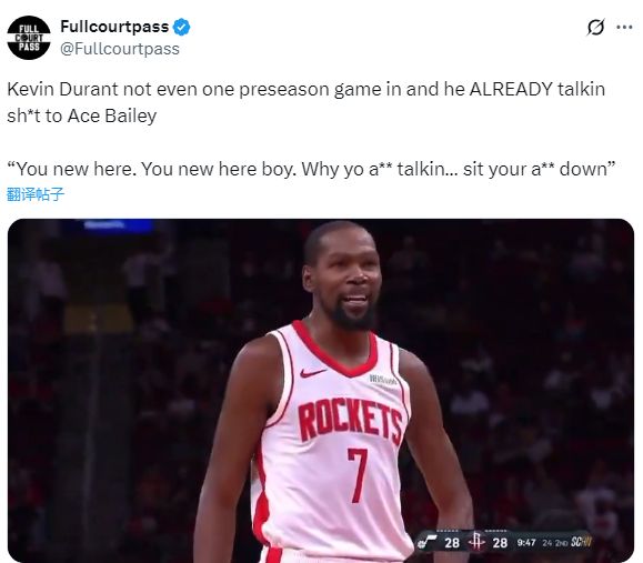 杜兰特身穿火箭7号球衣亮相,这是他为火箭出战的第一场比赛,与申京、阿门、小贾巴里-史密斯和谢波德一起首发出战,杜兰特登场时满脸笑容十分开心。