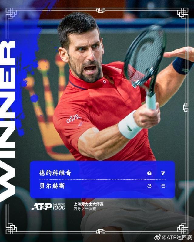 10月09日宣 ATP上海大师赛男单1/4决赛,38岁的德约科维奇对阵世界排名第44位的贝尔赫斯,最终德约以6-3、7-5击败对手,第10次打进赛会四强、第80次闯进大师赛男单四强。半决赛德约的对手将是资格赛黑马瓦舍罗。