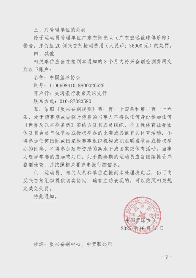 给予运动员管理单位广东东阳光队(广东宏远篮球俱乐部)警告,并负担20例兴奋剂检测费用(人民币:36000元)的处罚。