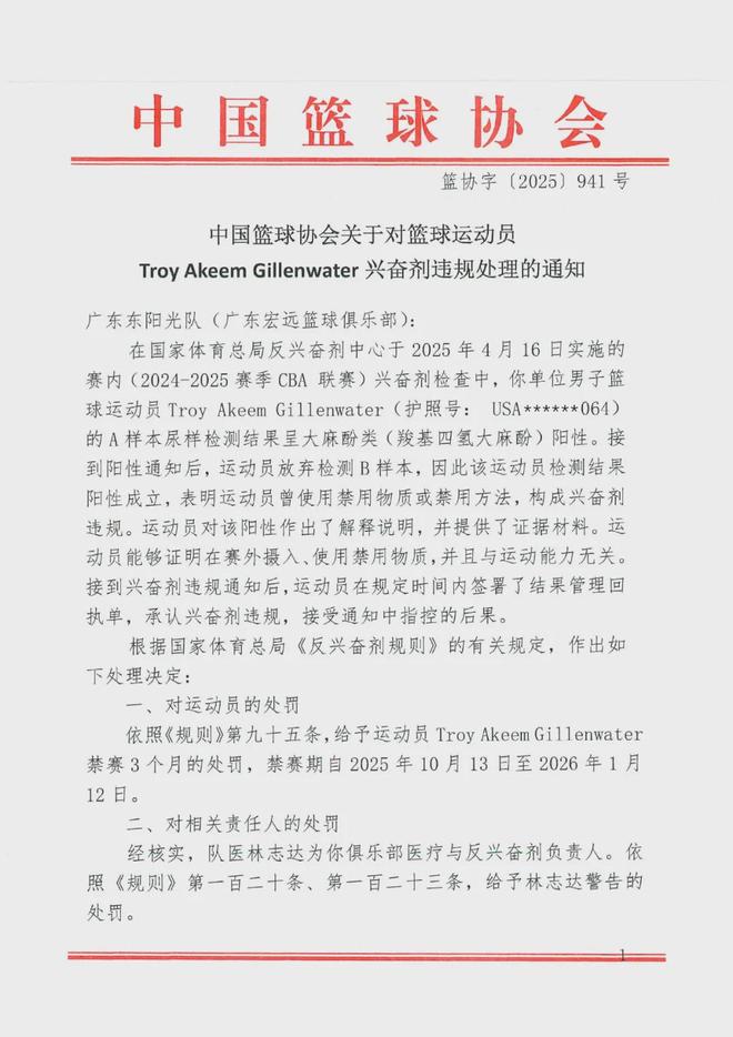 昨天(10月13日),中国篮球协会给广东东阳光队(广东宏远篮球俱乐部)下发《关于对篮球运动员Troy Akeem Gillenwater兴奋剂违规处理的通知》。通知提到,对兴奋剂违规的中国男子篮球职业联赛(CBA)外援吉伦沃特处以禁赛3个月的处罚。