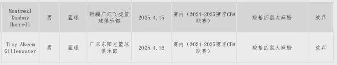 根据中国反兴奋剂中心在6月23日发布的公告显示,广东东阳光篮球俱乐部的Troy Akeem Gillenwater(吉伦沃特)和新疆广汇飞虎篮球俱乐部的Montrezl Dashay Harrell(哈雷尔)分别在CBA联赛4月16日和15日的赛内检测中被查出羧基四氢大麻酚阳性,两人均放弃B瓶检测。
