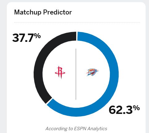 - NBA | ESPN预测揭幕战:雷霆获胜概率62.3%,火箭37.7%