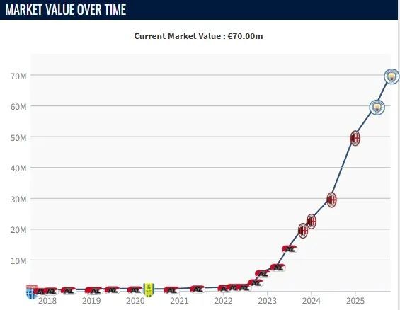 今夏以5500万欧转会费加盟曼城的赖因德斯,身价上涨1000万至7000万欧。