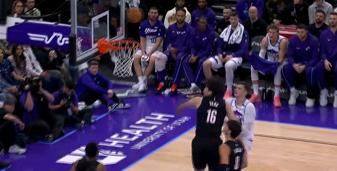 本场比赛,杨瀚森在第一节6分08秒的球队第一次轮换中登场,虽然上来就被凯斯勒打成2+1,但在随后一次进攻中,杨瀚森就接到卡马拉助攻,面对凯斯勒篮下打进!成功拿到生涯第二记运动战进球。