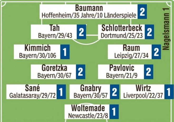 后卫:基米希(1)、若纳坦-塔(2)、施洛特贝克(2)、劳姆(2)