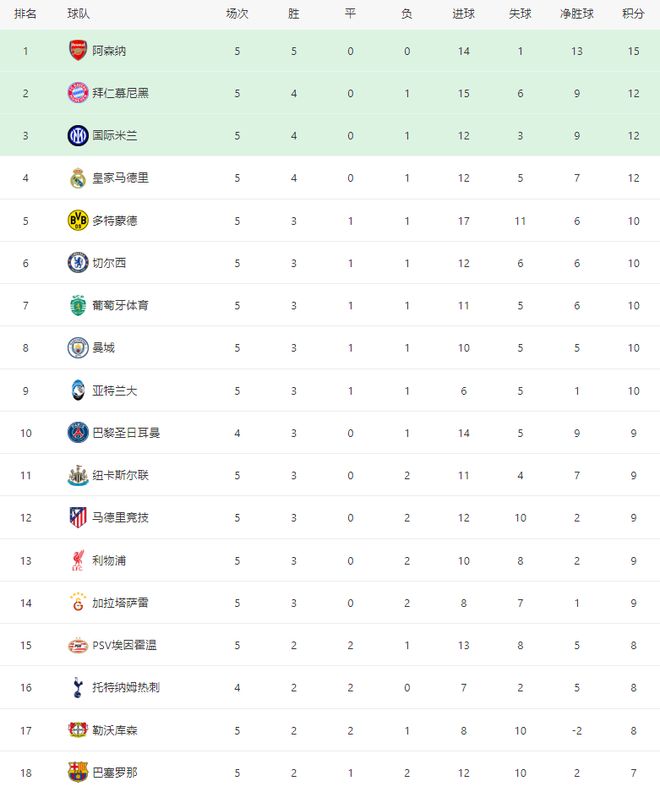 - 英超 | 欧冠积分榜:阿森纳全胜领跑,巴黎、拜仁、国米、皇马均12分
