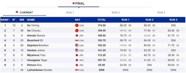 第一跳,苏翊鸣1980惊艳落地,得到86.25分。第二跳,凭借完美发挥,他拿到88.25分。最终,苏翊鸣以174.50分的总成绩强势夺冠。另一位中国选手葛春宇以159.50分收获银牌。