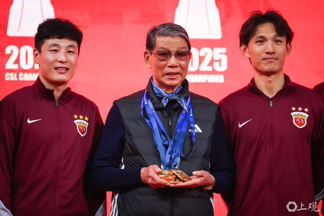 徐根宝指导亲临现场,武磊、颜骏凌、吕文君、王燊超、刘若钒、张琳芃、蒯纪闻、李新翔几位出自崇明基地的海港球员,将冠军奖牌佩戴在徐根宝的胸前,表达他们对恩师的感谢,场面温馨感人。