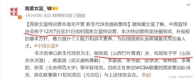 - CBA | 张子宇领衔!中国篮协将于12月7日至31日组织国家女篮特训营