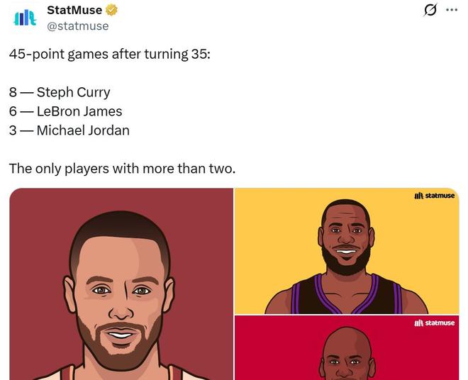 第二项:本场是库里30岁后第45次单场轰下40+得分,正式超越乔丹升至NBA历史第一。
