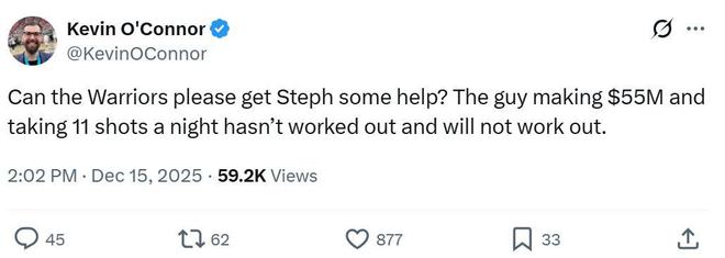 美记Kevin O'Connor直言勇士队需要为库里寻找帮手,让那些拿着5500万薪水的球员场均出手11次显然行不通,未来也难有转机。