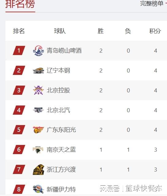 排在积分榜第2的是辽宁队,最近两场比赛,辽宁队的状态非常不错,先后击败了天津队和广厦队,这其中击败广厦队可以说是爆了不小的冷门。由于广东、北控等队也赢球的缘故,辽宁队的排名又上升一位,从积分榜第3名上升到第2。北控队这一战拿下天津队以后,他们的战绩也变成了2胜0负,一波两连胜后,他们的排名杀进积分榜第三的位置,而北京队则从积分榜第1,下滑到第4名。