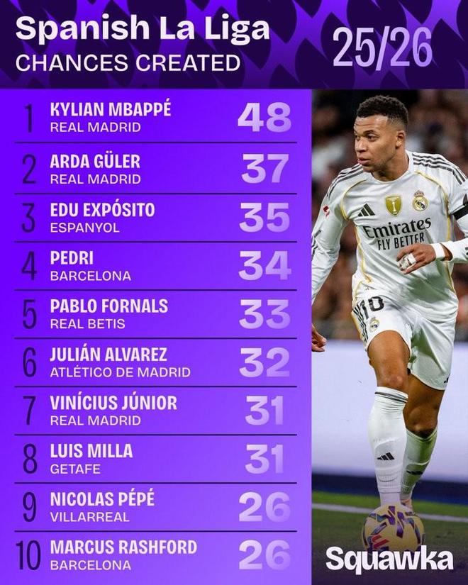 - 西甲 | 本赛季西甲创造机会榜:姆巴佩48次居首,居莱尔37次第二