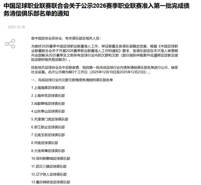 北京时间12月18日晚,中国足球职业联赛联合会官网公示2026赛季职业联赛准入第一批完成债务清偿俱乐部名单,中超层面包括北京国安在内的3家俱乐部无缘。