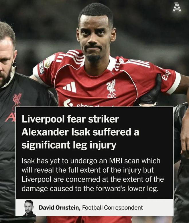 本轮英超,利物浦2-1战胜热刺的比赛中,红军前锋伊萨克腿部严重受伤。
