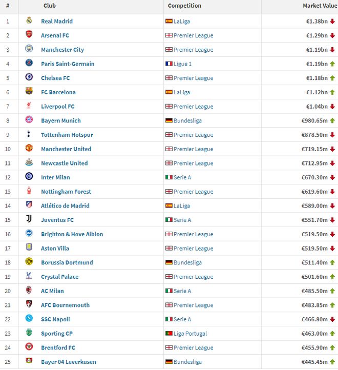 周三,《转会市场》公布2025年全世界身价最高的100支足球球队,皇马以13.8亿欧元排名榜首,阿森纳、曼城分别排名第2、3位。