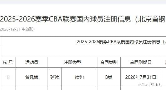2025-26赛季CBA常规赛第九轮比赛即将开打,元旦假期的“京粤大战”也正式进入最后倒计时。赛前,一则关于实力不俗的北京首钢男篮紧急注册曾凡博的消息沸沸扬扬。据CBA官方公示信息来看,北京首钢队已正式完成锋线核心曾凡博的注册手续,双方签订的是一份为期三年的B类合同。这意味着,此前因合同问题缺席赛季初期部分比赛的锋线大侧翼曾凡博,已完全具备代表北京首钢队出战的资格,并确认在明晚主场迎战夺冠大热门广东男篮的比赛中迎来本赛季的首秀。