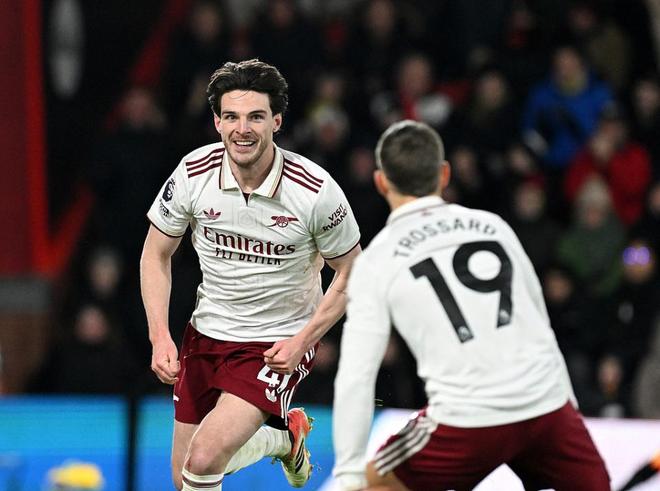 第54分钟,厄德高横传,跟进的赖斯弧顶位置,贴地斩破门,阿森纳2-1伯恩茅斯。