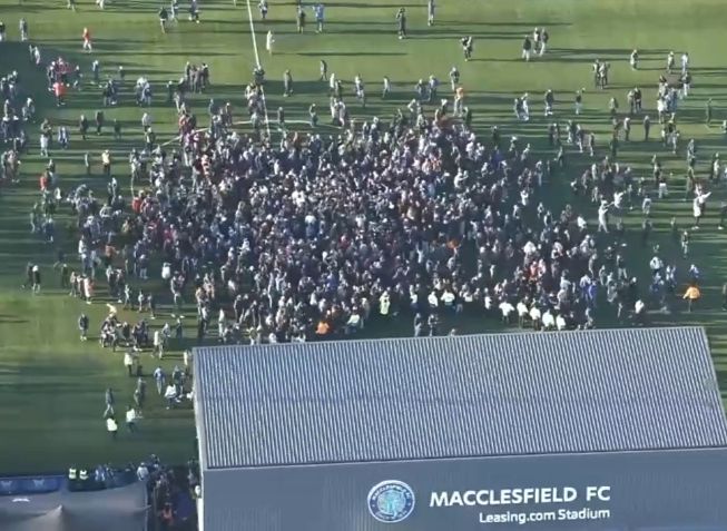 当终场哨响,奇迹正式诞生时,激动的麦克尔斯菲尔德球迷疯狂冲进场内,与球员一起激动拥抱庆祝。